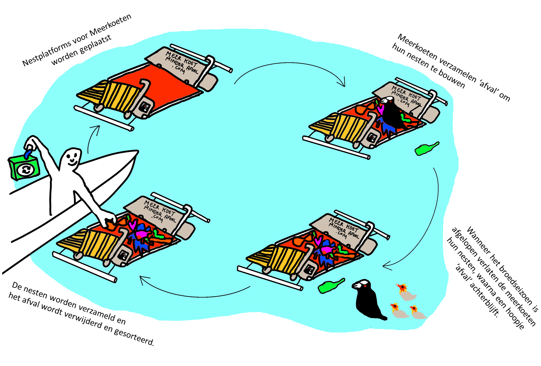 De meerkoeten gebruiken afval in hun nesten. In het stadscentrum vind je nu eenmaal meer bevuiling.