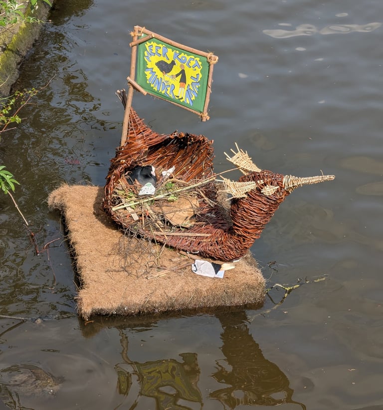 Watervogels, zoals de meerkoet, nemen het platform in gebruik en beginnen met het bouwen van hun nest.