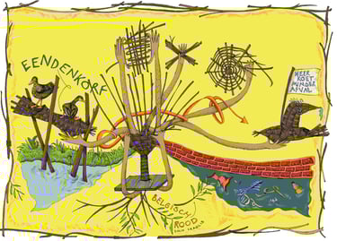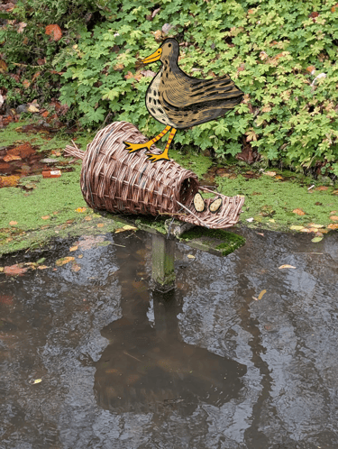 The eendenkorf (Eng. duck basket) is a human-made object, traditionally placed by Dutch hunters to provide wild ducks with a safe place to breed and to protect them from land-based predators such as foxes, martens, and cats, which naturally avoid water. Supported by a wooden pole construction and placed on quiet waters, these baskets help eliminate the threat of land predators during the breeding season, while also protecting ducks and their eggs from harsh weather conditions. (1)